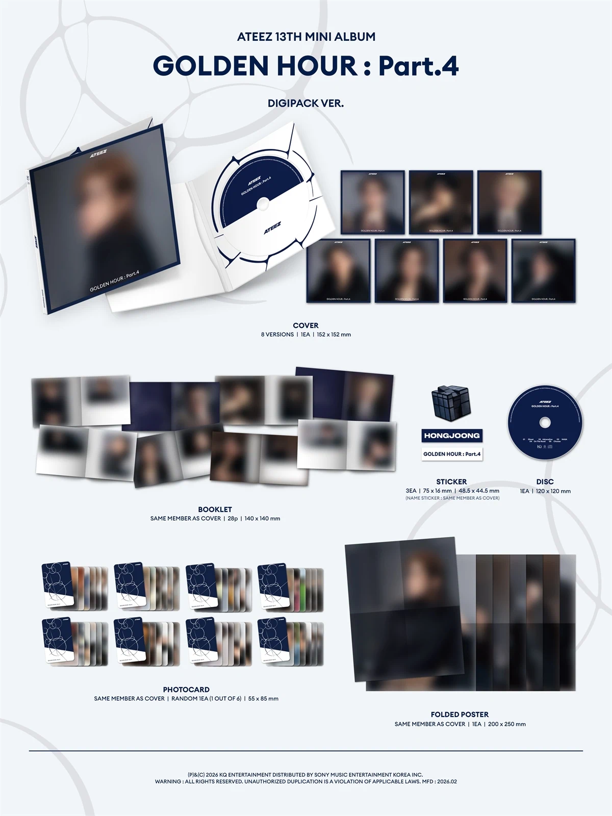 ATEEZ - GOLDEN HOUR : Part.4 DIGIPACK Ver. מציגה את הפרק הרביעי בסדרת Golden Hour בפורמט דיג'יפאק קומפקטי. הגרסה שומרת על הקונספט של התקופה הזו בדיסקוגרפיה של ATEEZ ומציעה חוויית אלבום ממוקדת יותר. מהדורה שמתאימה למי שמעדיף פורמט קטן אך רשמי. חלק מהמשך ישיר של עידן Golden Hour.