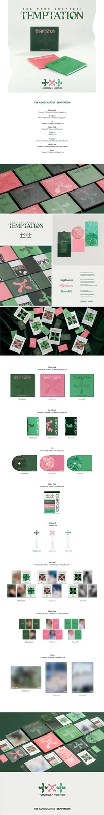 TXT חוזרים עם THE NAME CHAPTER: TEMPTATION, אלבום שממשיך את הסיפור הרגשי והמרתק של הקבוצה. האלבום מציג שילוב של סאונד מודרני ומלודי עם נגיעות של סגנונות שונים, וכולל את שיר הנושא Sugar Rush Ride. כל גרסה מביאה עמה חוויית אספנות מלאה עם פוטובוק מפורט, דפי מילים, סט פוטוקארדים ופוסטר מתקפל. האלבום מיועד גם למעריצים חדשים וגם לאספנים ותיקים, עם עיצוב מוקפד ותוכן עשיר. זו חוויה שמחברת בין הסיפור הקבוצתי לבין רגעים אישיים של חברי הקבוצה. הקאמבק הזה מביא את TXT עם אנרגיה חדשה ורעננה.